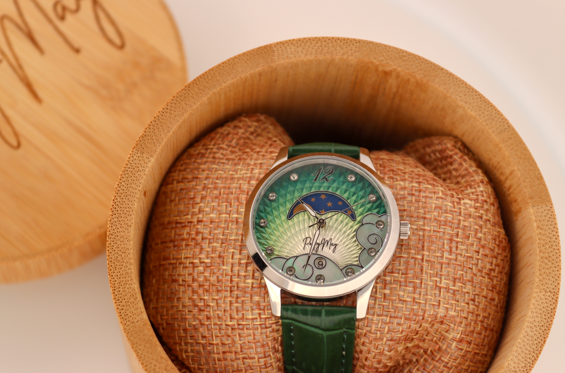 Each timepiece arrives in a stunning Poppy May bamboo presentation box, laser-etched for a natural yet luxurious finish.